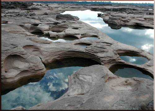 จังหวะฟ้าใส เห็นฟ้าสะท้อนอยู่ในแอ่งน้ำ ผืนทรายสะท้อนแอดเป็นประกาย ร่องหินที่แตกระแหงบ่งบอกถีงการผจญภัย การต่อสู้ของสามพันโบกกับกระแสน้ำ แรงลม แต่ยังยืนหยัดจนถึงวันนี้